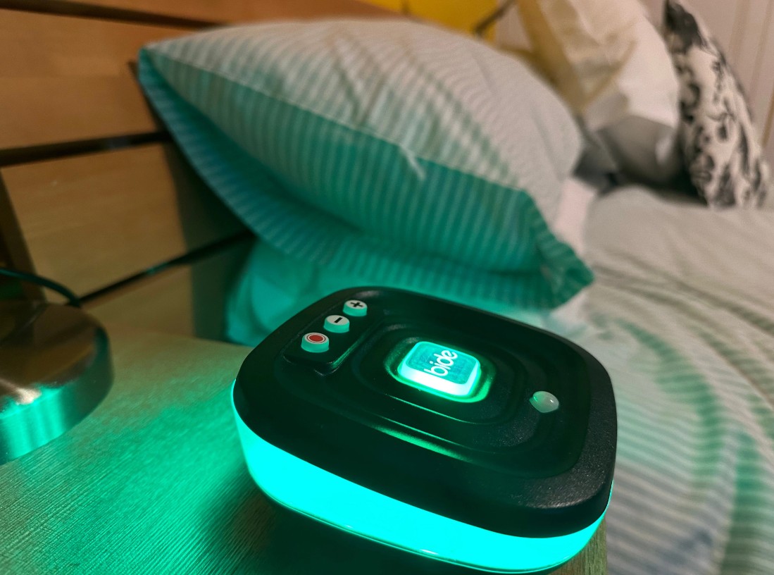 Bide discreetly detects that the user has woken up. It then lights up and plays them a voice message from a loved one or carer that prompts them to move more safely. This small and simple reminder is often enough to support users to get out of bed carefully.